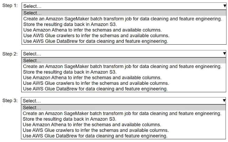Reason: Once the schema is known, data cleaning and transformation are necessary. AWS Glue DataBrew provides an interactive, visual interface to clean, normalize, and transform data without writing code. This is efficient for preparing the data for ML models.