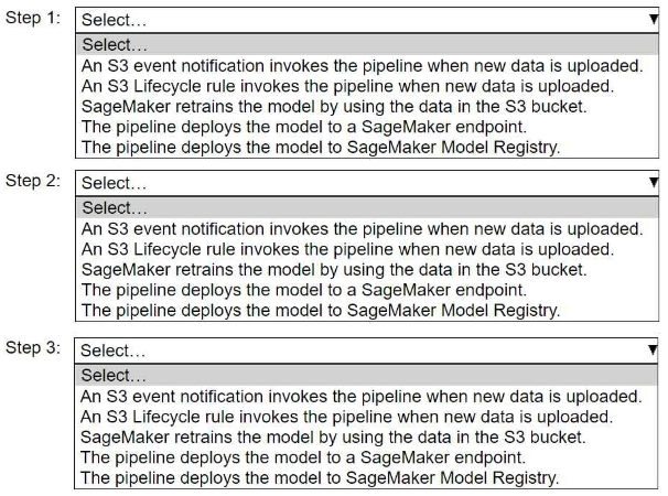The third step is the deployment of the retrained model. The question explicitly asks for the model to be deployed, and deploying to a SageMaker endpoint makes the model available for inference. Deploying to the Model Registry only catalogs the model but doesn't make it usable for real-time predictions. Model Registry is typically an earlier step, before deploying to an endpoint, as it serves as a central repository for model versions. Therefore, deploying to the endpoint is the correct final step to fulfill the requirement of hosting the model for use.