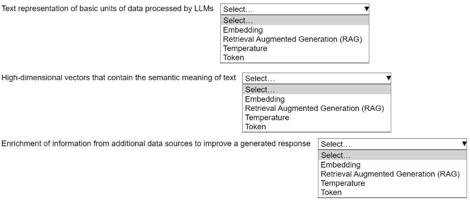 Select the correct generative AI term from the following list for each description. Each term should be selected one time or not at all. (Select three.)