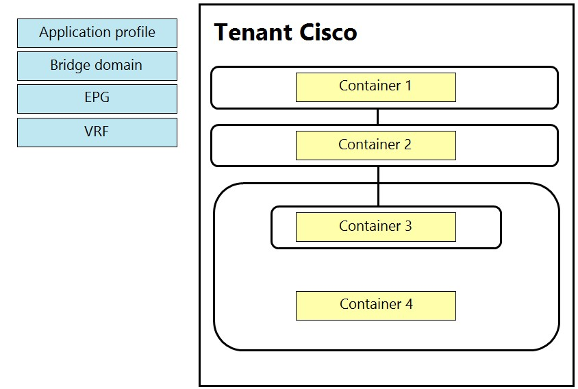 The correct drag-and-drop configuration, based on the object hierarchy in Cisco ACI, is as follows: VRF -> Bridge Domain (BD) -> EPG -> Application Profile. This reflects the parent-child relationship and dependencies between these objects.