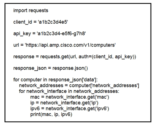- C: "get the process and PID information from the computers in the network" - While AMP can collect process and PID information, this is less directly related to the API's interaction with a Cisco security appliance compared to gathering network interface information.