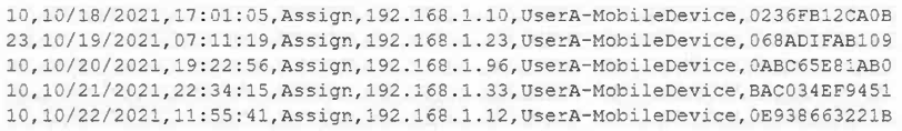 - B. Wireless network auto joining: Auto-joining refers to a device's ability to automatically connect to known wireless networks. DHCP logs don't directly verify auto-joining behavior; rather, they show the result of a device successfully joining a network and obtaining an IP address. The pattern of connections, not the auto-joining mechanism, might be inferred.