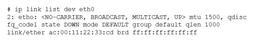 - B: The Ethernet broadcast address is ff:ff:ff:ff:ff:ff, not ac:00:11:22:33:ff. Even if the broadcast address were incorrect, it wouldn't cause a "NO-CARRIER" state.