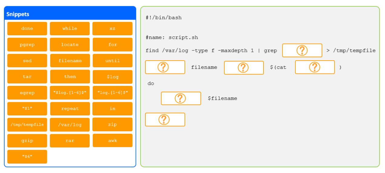 Drag and drop snippets to fill the blanks to build a script that performs the actual compression of rotated log files.
