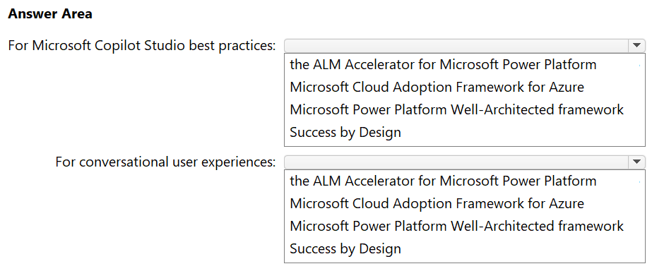 I disagree with the provided answer in the image. The community discussion and official Microsoft documentation indicate that Microsoft Power Platform Well-Architected framework is the correct choice for both requirements.