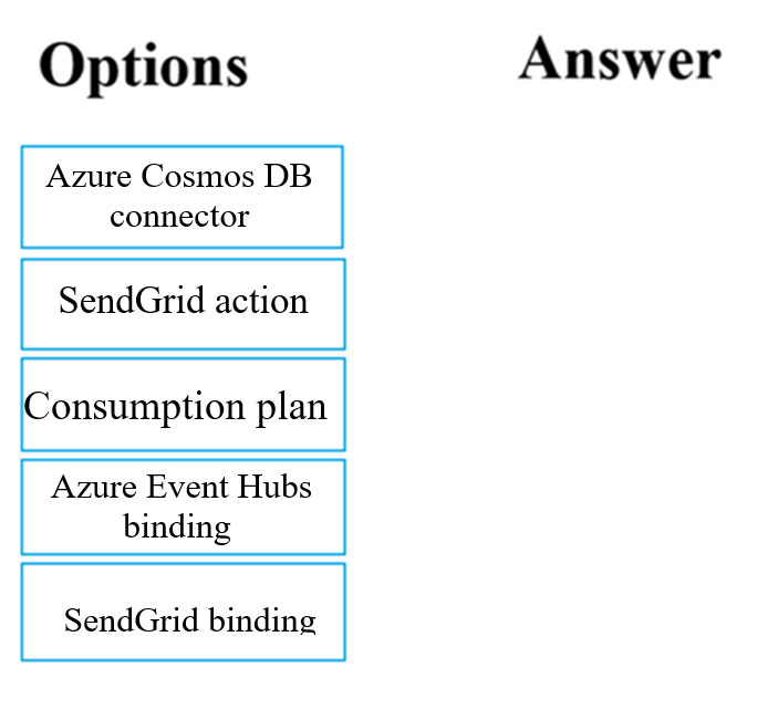 Which of the following should you configure the function app to use? Answer by dragging the correct options from the list to the answer area.
