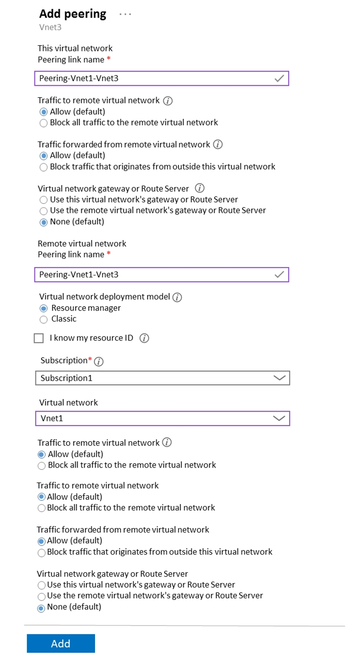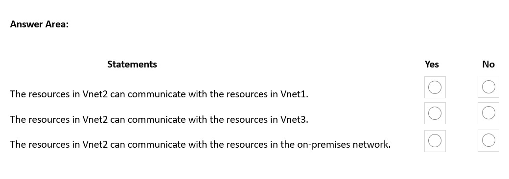 - Statement 3: Resources in Vnet2 can communicate with resources in Vnet3. - No. As mentioned earlier, VNet Peering is non-transitive. Since VNet2 and VNet3 only have peering connections with VNet1, they cannot communicate directly with each other without a direct peering connection or other routing solution.