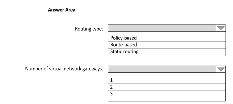 The recommended answer is to configure the solution with route-based routing and two virtual network gateways.