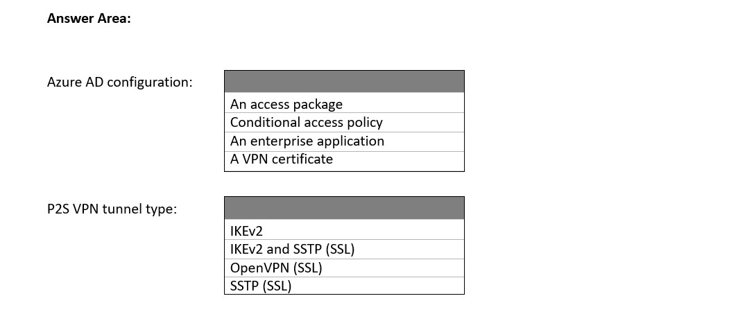 You need to ensure that administrators can use Point-to-Site (P2S) VPN connections to access resources in the virtual network. The connections must be authenticated by Azure Active Directory (Azure AD).