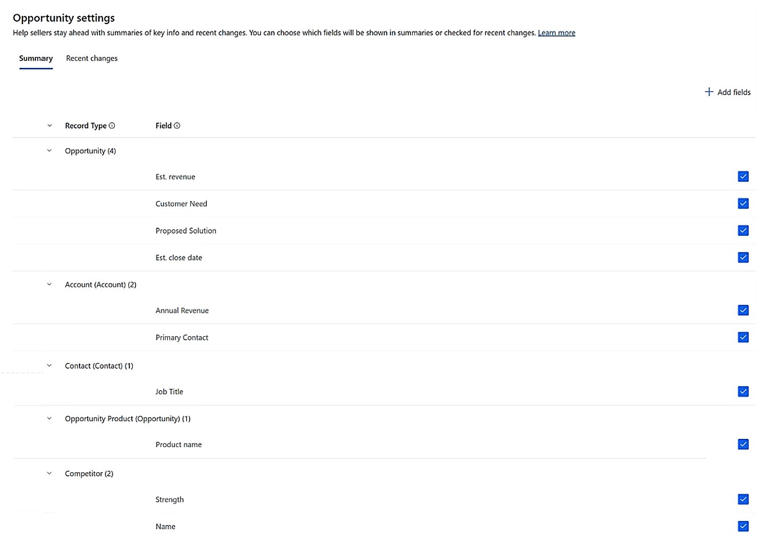 The following screenshots show the configured fields for opportunity settings summaries and recent changes in Copilot.