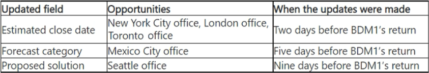 BDM1 has been on vacation for two weeks. During vacation, BDM1 did NOT log into Dynamics 365, and BDM2 made the following updates to several open Northwind Traders opportunities.