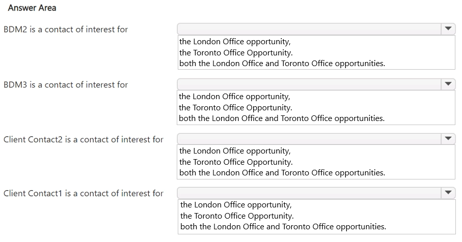 Contoso Ltd. has 30 business development managers (BDMs) across its sales teams. Each BDM is responsible for selling janitorial services to new and existing clients. All BDMs are assigned the sales manager security role in Dynamics 365 Sales.