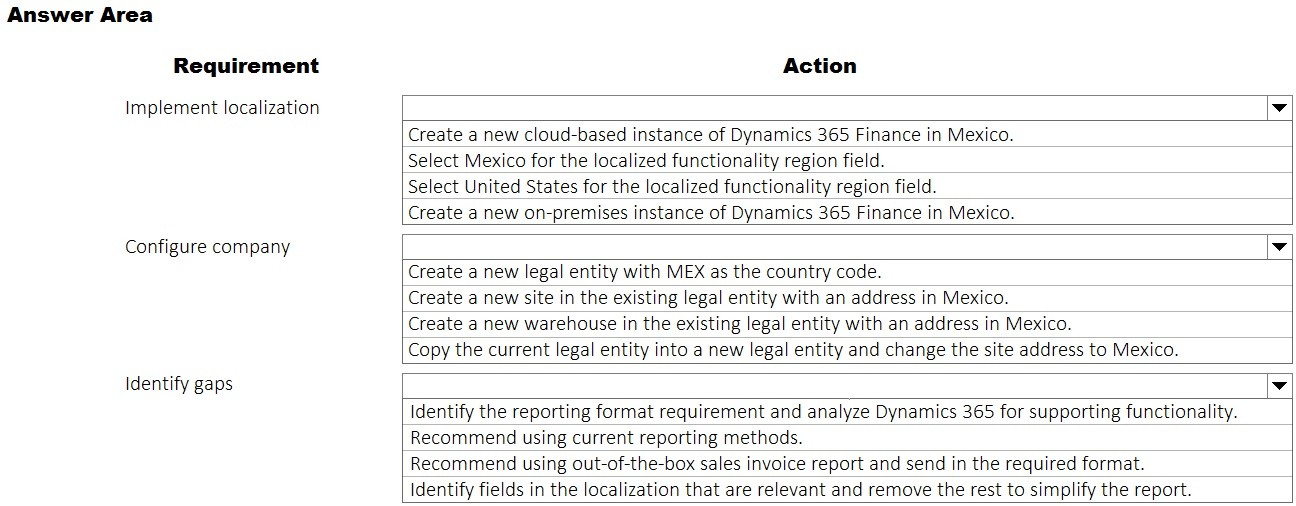 A United States-based company has a cloud-based Dynamics 365 Finance implementation. The company plans to open a new location in Mexico.