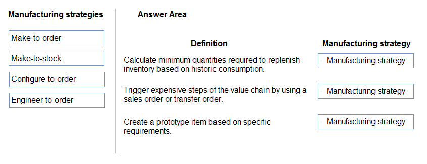 To answer, drag the appropriate manufacturing strategy from the column on the left to its definition on the right. Each manufacturing strategy may be used once, more than once, or not at all.