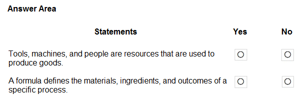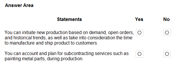 Selecting 'No' for either of these statements would contradict the core capabilities of Dynamics 365 Supply Chain Management concerning manufacturing and procurement. The system is specifically designed to handle various forms of manufacturing, including those that involve external parties for specific processes. Without the ability to integrate subcontracted work into production orders or to manage the external vendor's services through purchase orders, the system would be incomplete for many real-world supply chain scenarios. Therefore, 'No' is an incorrect choice for either statement, as it would imply a significant limitation that does not exist in the actual product functionality.