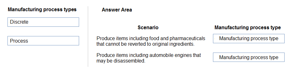 What should you recommend? To answer, drag the appropriate manufacturing process types to the correct scenarios. Each manufacturing process type may be used once, more than once, or not at all. You may need to drag the split bar between panes or scroll to view content.