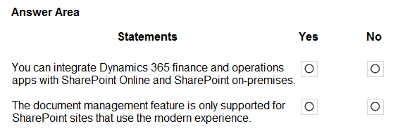 Other potential answer combinations, such as "Yes" for either statement or a mixed combination like "No" for the first and "Yes" for the second, are incorrect. These alternatives contradict the established technical specifications and limitations outlined in Microsoft's official documentation. Specifically, suggesting "Yes" for on-premises SharePoint support for D365 F&O/SCM document management is inaccurate, as Microsoft's standard integration for these apps relies on SharePoint Online. Similarly, asserting that a modern SharePoint site is required ("Yes" for the second statement) is incorrect, as the document management integration supports both classic and modern SharePoint environments. These incorrect alternatives were outweighed and disproven by the detailed analysis and direct references to official sources within the discussion.