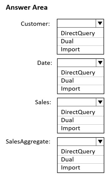 Reasoning: Similar to the Customer table, the Date table is a dimension table related to both the Sales and SalesAggregate fact tables. Dual storage mode ensures optimal performance by allowing Power BI to use cached data when interacting with the SalesAggregate table and direct queries when interacting with the Sales table.