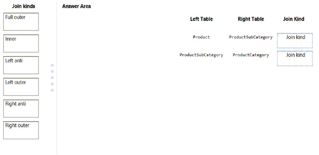 - Why other options are not suitable: An inner join would exclude ProductSubCategories that do not have a ProductCategory, which violates the requirement to include all ProductSubCategories. A Right Outer join would only keep the records of ProductCategory and matching ProductSubCategory, while the question requires to include all ProductSubCategory. A Full Outer Join will also work functionally, however, is not the most performant and optimized join in this case.