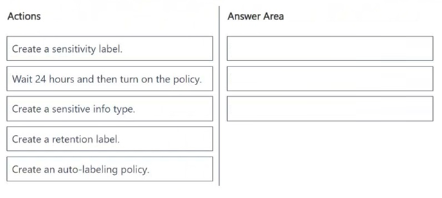 In summary, based on the question, the discussion and the information available in Microsoft documentation, creating a sensitivity label, creating an auto-labeling policy, and waiting 24 hours is the correct sequence of actions.
