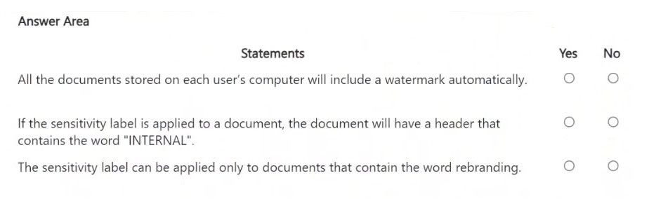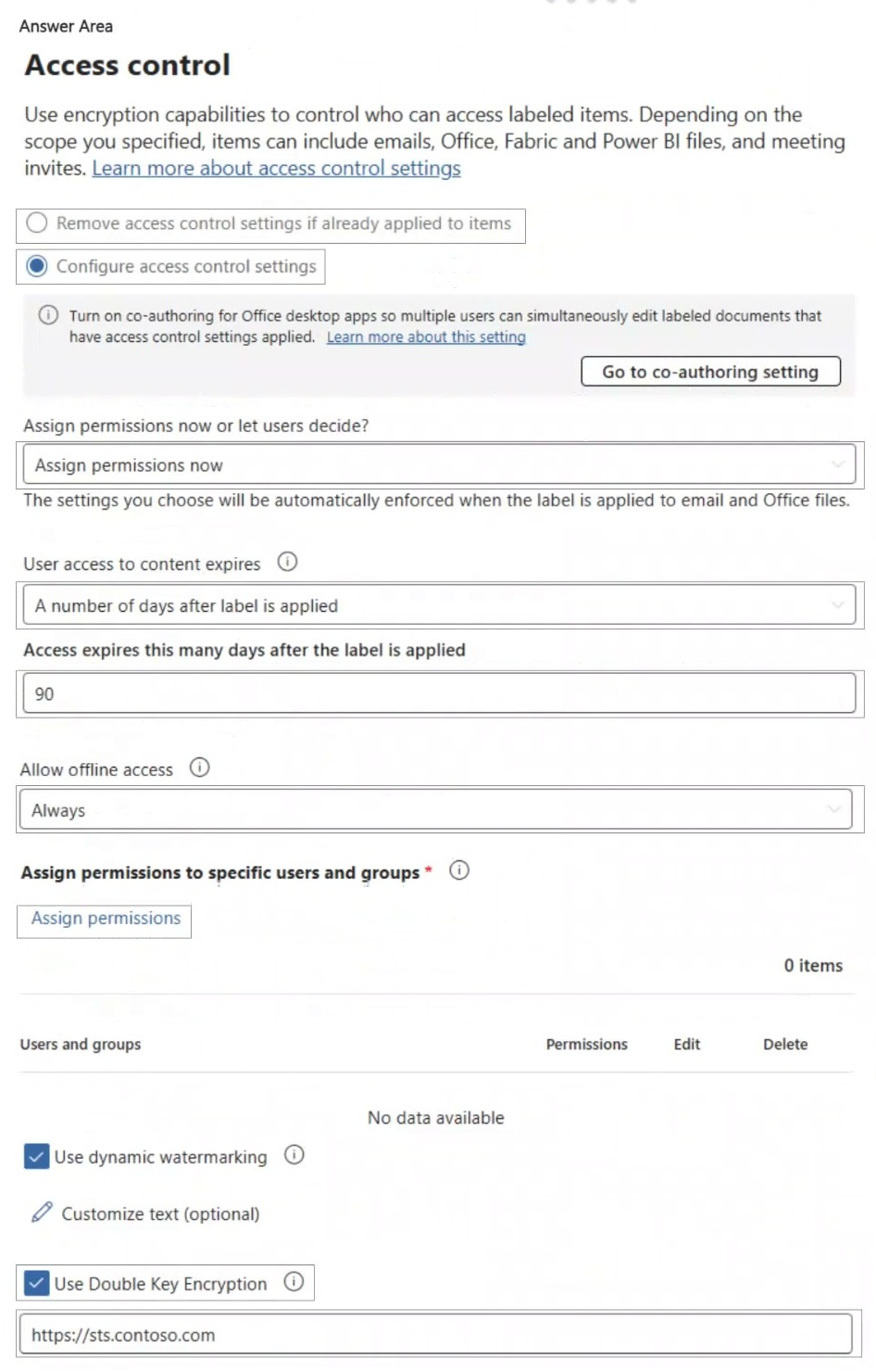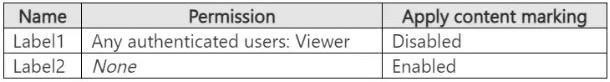 - Creating a retention label: While retention labels are important for managing data lifecycle (retention and deletion), they are not directly related to the immediate goal of protecting credit card information with encryption, access controls or watermarks. Retention labels govern how long content is kept, not how it's protected.