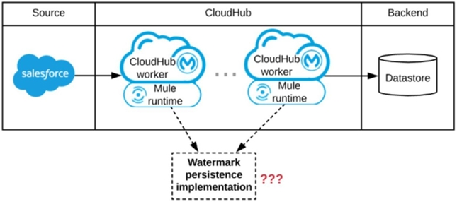 - D. Persistent VM Queue: VM queues are in-memory queues within a single Mule instance. They are not distributed or persistent across workers or restarts of the application in a CloudHub environment. Therefore, they are unsuitable for maintaining the watermark in this scenario.