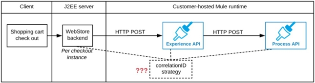 - B. The web store backend generates a new correlation ID value at the start of checkout and sets it on the X-CORRELATION-ID HTTP request header in each API invocation belonging to that checkout No special code or configuration is included in the Experience API and Process API implementations to generate and manage the correlation ID
