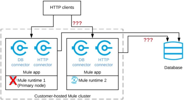 Refer to the exhibit. A Mule application is deployed to a cluster of two customer-hosted Mule runtimes. The Mule application has a flow that polls a database and another flow with an HTTP Listener.