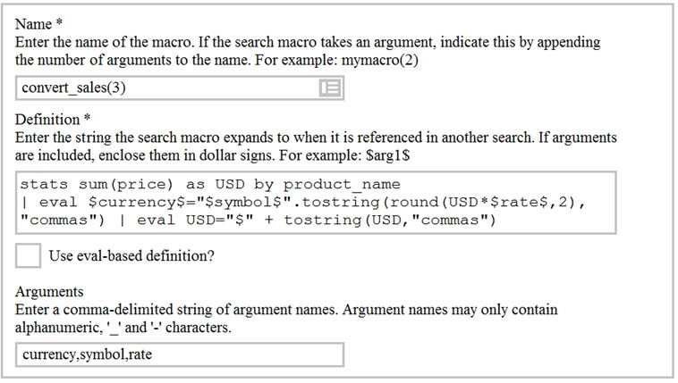 - A. "convert_sales(euro,€,.79)": Using double quotes is less conventional for calling macros in Splunk, though it might work in some contexts, single quotes are generally preferred.